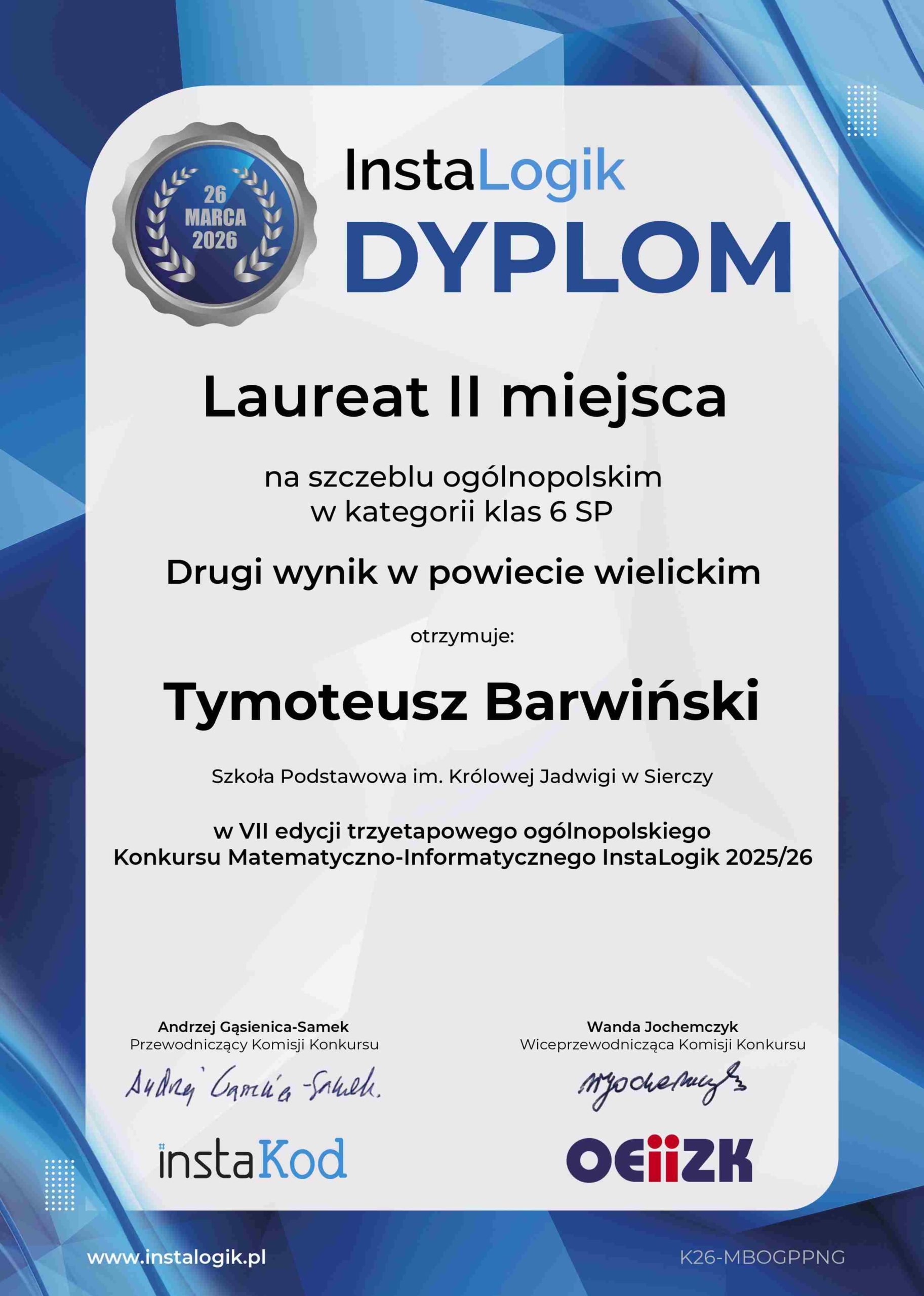 Z radością informujemy o wybitnym osiągnięciu ucznia naszej szkoły, Tymoteusza Barwińskiego, w VII edycji ogólnopolskiego konkursu matematyczno-informatycznego InstaLogik 2025/2026.